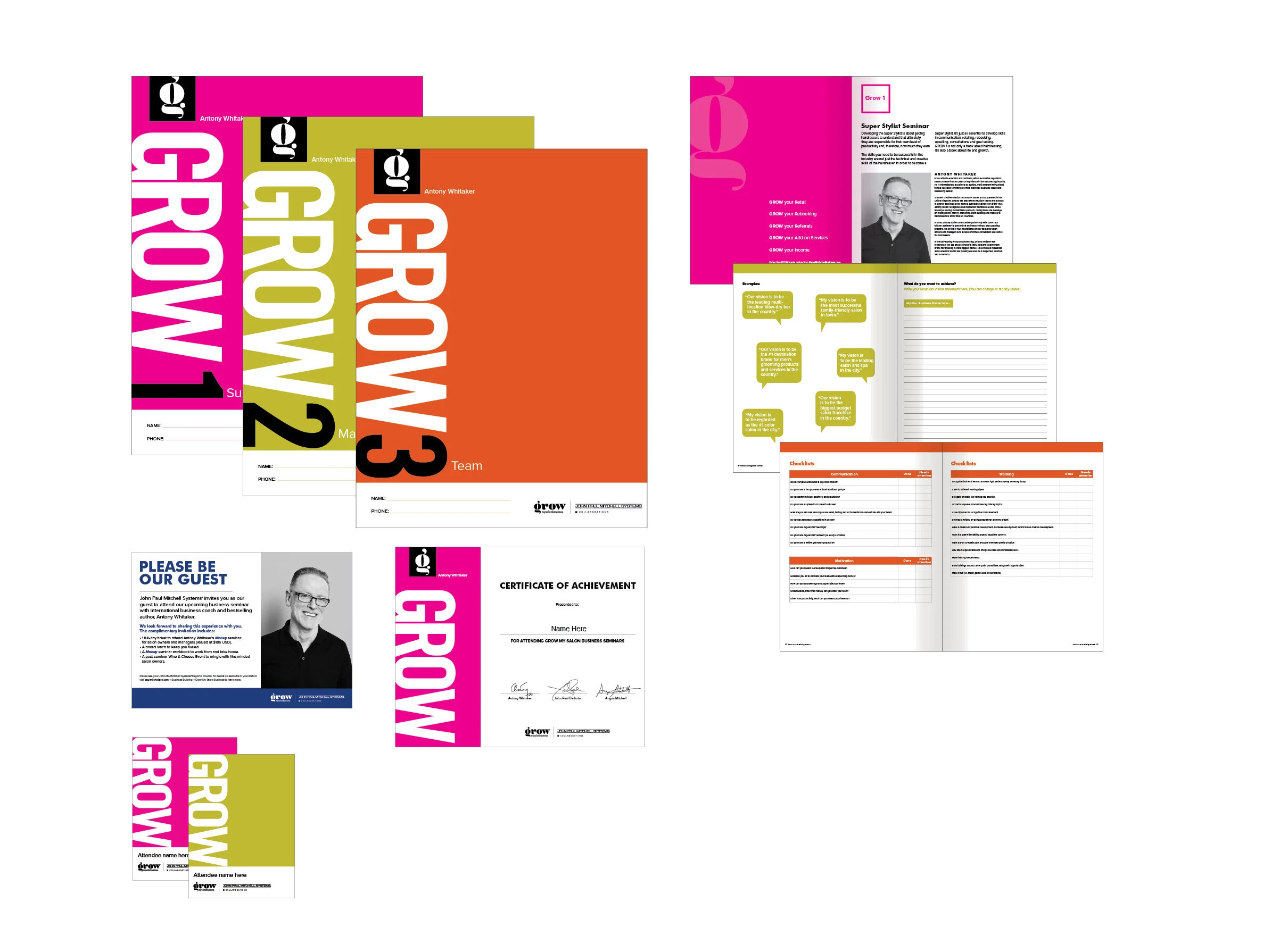 This is a series of Booklets and collateral pieces for a Antony Whitaker, an educator and motivator and partner of John Paul Mitchell Systems.